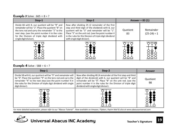 Book B is the practice book. All the concepts, which were explained in Book-A of this level, have been given here for thorough practice. Dailly practice tracker has been given at the start of this book. Daily practice of 10 minutes is mandatory for the students. The “Dictation Book” for oral practice is also available here. There are many ways to teach numbers to kids. Abacus is a great tool to teach your child simple math such as counting, addition, subtraction, multiplication, and even division. This is the “B” book of Level-4, which contains Plus and Minus of triple-digit numbers mentally, multiplication of triple-digit multiplicand with the single-digit multiplier. It also contains a division of Double and triple-digit dividends with a single-digit divisor.