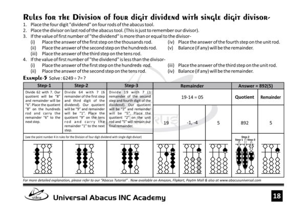 There are many ways to teach numbers to kids. Abacus is a great tool to teach your child simple math such as counting, addition, subtraction, multiplication, and even division. This is the “B” book of Level-6, The topics which are covered in this level are Plus/Minus/ Multiplication/ Division/Square/BODMAS. It has the division of four-digit numbers by the one-digit number. Multiplication of Double-digit by double-digit number, Square of Double-Digit numbers, and introduction to BODMAS formulae. It helps in the whole brain development of a child. These Books are very attractive and of very good quality. This book is suitable for those students only, who have completed the first 5 Levels of Abacus education.