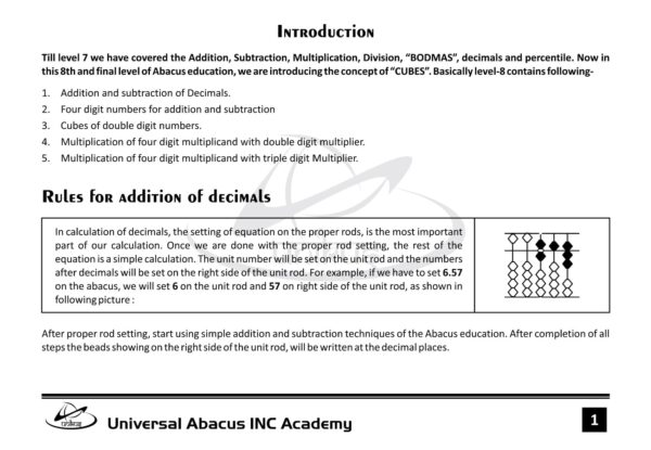 There are many ways to teach numbers to kids. Abacus is a great tool to teach your child simple math such as counting, addition, subtraction, multiplication, and even division. This is a combo pack of “A & B” books of Level-8. Other than the topics of Plus/Minus/ Multiplication/ Division/Square/BODMAS / Decimals / and percentage (%) which were covered in Level-7, this level contains CUBES also. It has a multiplication of Four-digit numbers with three-digit numbers, decimals of Triple and Four-digit, division with Four-digit numbers with one-digit numbers. Also special emphasis on mental maths. It helps in the whole brain development of a child. These Books are very attractive and of very good quality. These books are suitable for those students only, who have completed the first 7 Levels of Abacus education.